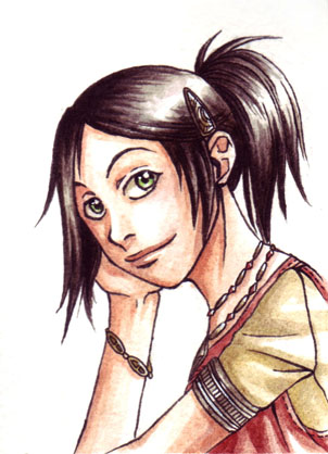 Der letzte Schritt bei der Kleidung besteht darin, dass ich noch Details wie den Schmuck coloriere und mit Deckweiß ein paar Glanzpunkte setze (z.b. im Auge und bei der Kette). Dann ist der Vordergrund soweit fertig.